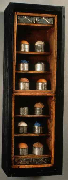 - box, 22 1/2"x7 1/2"x4 3/4", wood, tin, thread, 1999