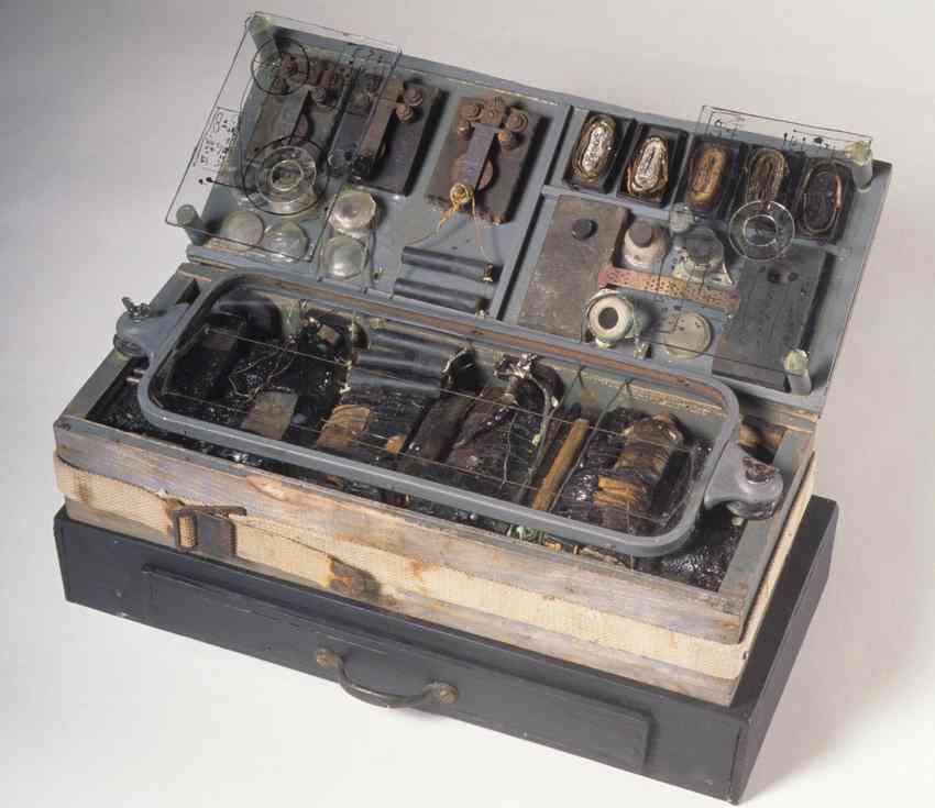 DETONATOR BOX - box with lid, 17"x14 1/2"x10 1/2", metal, wire, ceramics, glass, 2001