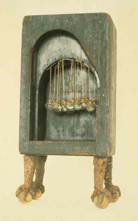 FURNACE BOX - box on metal legs, 15 1/2" x 8" x 5 1/4 ", wood, metal, glass, string, 1995